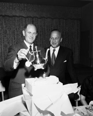 Ray O. Ryan, left, who will leave soon for San Diego to be Convair's top manufacturing chieftain, examines part of a silver tea service presented him and Mrs. Ryan at Colonial Country Club. with him is August C. Esenwein, who succeeds Ryan as Fort Worth division manager. Published in Fort Worth Star-Telegram morning edition December 30, 1950.