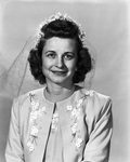 Image of Mrs. Richard D. Smith. She and Captain Richard D. Smith were married in the bride's parents, Mr. and Mrs. R. C. Ashley, 2805 Ryan Pl Dr., by Reverend A. B. VanArsdale. Given in marriage by her brother, James W. Holder of Tulsa, the bridge wore a street-length dress of blue wool jersey decorated with white felt flowers and rhinestones. Her shoulder-length veil of brown lace fell from a tiara of pearlized orange blossoms, and she carried stephanotis on a white prayer book. Captain and Mrs. Smith will reside at 1919 Prevost. Published in Fort Worth Star-Telegram evening edition January 1, 1951.