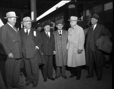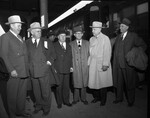 Group of Tennesseans arriving here for Cotton Bowl Game. Left to right: Governor Gordon Browning of Tennessee, Mayor Edgar Deen, Publisher Silliamn Evans of Nashville, Mayor Thomas L. Cummings of Nashville, Amon Carter and Chancellor Harvie Branscomb of Vanderbilt University. Four shots of group.