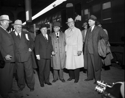 Group of Tennesseans arriving here for Cotton Bowl Game. Left to right: Governor Gordon Browning of Tennessee, Mayor Edgar Deen, Publisher Silliamn Evans of Nashville, Mayor Thomas L. Cummings of Nashville, Amon Carter and Chancellor Harvie Branscomb of Vanderbilt University. Four shots of group.