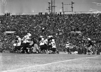 Tommy Fields, of Wichita Falls, starts a 23-yard touchdown run while mates bottle up the Austin defenders in the third period of the game at Dal-Hi Stadium. Cliff Taylor (No. 51), Billy Coulson (No. 22), and Everard Terrell (No. 10), are also pictured in this photo.