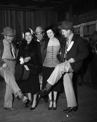 Mrs. S. T. Williams, left, and Mrs. C. S. Tollett, both of Crossville, were welcomed to "Where the West Begins" by Harold Webb, Bobby Bragan and Dick Jones, left to right, of the Chamber of Commerce goodwill committee.