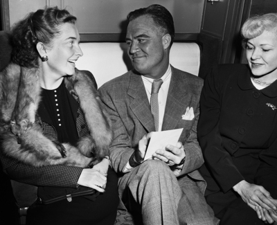 Getting a breath of fresh air as the Nashville Tennessean Cotton Bowl Special rolled into Texas for a two and a half day visit in Fort Worth are, Mrs. Jack Farr, wife of the Tullahoma, Tennessee mayor is interviewed by a Nashville Tennessean page one columnist, Red O'Donnell. Mrs. I. N. Hamilton of South Pittsburgh, Tennessee, is at right. Published in Fort Worth Star-Telegram morning edition December 31, 1950.
