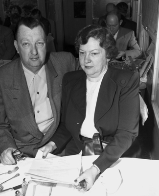 Getting a breath of fresh air as the Nashville Tennessean Cotton Bowl Special rolled into Texas for a two and a half day visit in Fort Worth are, Mr. and Mrs. Charlie Rice of Shelbyville, Tennessee, were early risers on the special. Rice, a sportswear manufacturer, also raises Tennessee Walking Horses. Published in Fort Worth Star-Telegram morning edition December 31, 1950.