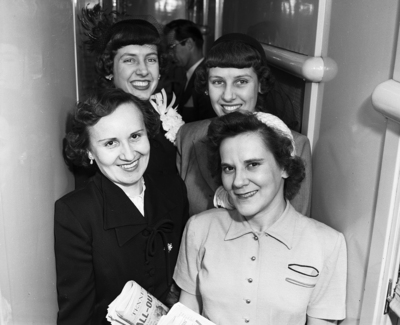 Getting a breath of fresh air as the Nashville Tennessean Cotton Bowl Special rolled into Texas for a two and a half day visit in Fort Worth are, a quartet of nurses awaiting a seat on one of the two diners. They are, left to right, front, Ann and Winnie Paxton, sisters, and back, same order, Jane and Jean Bennett, twin sisters, who will visit an aunt and uncle, Mr. and Mrs. Robert Edwards of Watauga Courts. Published in Fort Worth Star-Telegram morning edition December 31, 1950.
