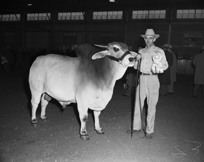 Louisiana State University (LSU) showed the reserve champion Brahman bull of the Stock Show. Landreth Reynolds, LSU herdsman, is shown here with the bull, Banso Manso of LSU 6th.