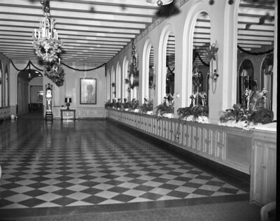 Series(not published) of New Year's Eve party attended by Mr. and Mrs. Amon Carter. Shown is a dining room with chandeliers and with windowless arches to the area to the left. Décor seen is a clock, lamp, painting, and a table.