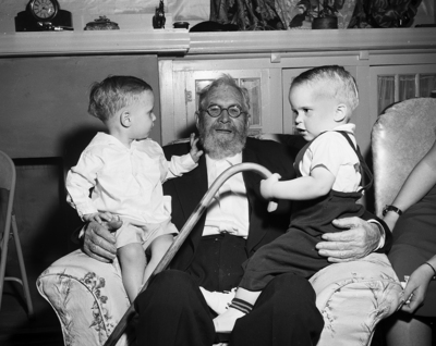 John Marvin Dexter, left, and Chris Carmichael, extreme right, each 21 months old, marvel at the beard and cane of 93-year-old J. S. Carmichael at a family reunion in his honor at the residence of Mr. and Mrs. J. R. Barrs, 1205 E. Baltimore. Published in Fort Worth Star-Telegram morning edition January 2, 1951.