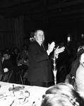 Silliman Evans Sr., publisher of the Nashville Tennessee, leads the applause for a good time in Texas when 265 special train riders ate filet mignon steaks at the Seybold Guest Ranch West of Mineral Wells. Published in Fort Worth Star-Telegram evening edition January 1, 1950.