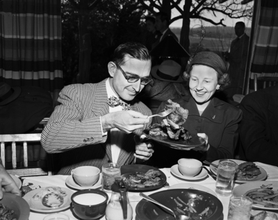 Dr. Ed Etier of Oak Ridge forks out a filet mignon for Mrs. Dexter Davis, wife of another Oak ridge physician. The visitors arrived by special train, celebrated the New Year at a Hotel Texas dance and well see the Cotton Bowl. Published in Fort Worth Star-Telegram morning edition January 1, 1951.