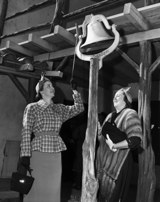 Two Tennesseans got the jump on ringing out the old and ringing in the New Year at Seybold Guest Ranch west of Mineral Wells when Mrs. F. X. O'Donnell pulled the cord for 265 Volunteer grid fans to come to a steak dinner. At right is Mrs. P. M. Estes. both are from Nashville, Tennessee. Quartered in Fort Worth for the weekend, the fans will see the Cotton Bowl. Published in Fort Worth Star-Telegram morning edition January 1, 1951.