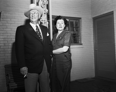 Image of Mr. and Mrs. Lynn Gillham, owners of Alisal Dude Ranch in California. They "stood up" for Gable and Lady Sylvia. Published in Fort Worth Star-Telegram evening edition January 2, 1950.