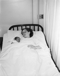 Image is of Mrs. Jerry Hughes and newborn Martha Elaine. They are laying together in a hospital bed. "the baby is 1951 Fort Worth queen."