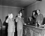 Associate Justice Frank P. Culver, left, and 17th district court Judge Jack M. Langdon were two of five judges given the oath of office in the Court of Civil Appeals Courtroom by Chief Justice Atwood McDonald, at right. Sitting in background is former Associate Justice John Spear who retired after 14 years on the appellate bench. Published in Fort Worth Star-Telegram evening edition January 1, 1951.