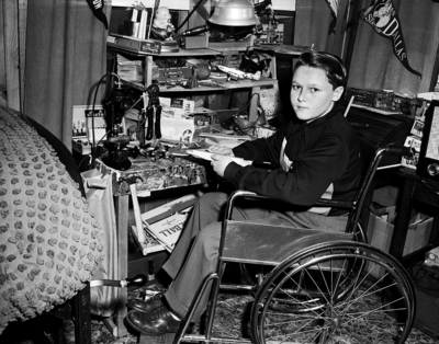Image of Richard Lee Leddon Jr., 12-year-old son of Mr. and Mrs. Richard Lee Leddon, 1311 Seventh Avenue, spends his days in a wheelchair as a result of polio. He is shown in his room, with model airplanes. Published in Fort Worth Star-Telegram evening January 4, 1951.