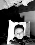 Image of Larry Griffin, who has bulbar polio, shown in an iron lung. Published in Fort Worth Star-Telegram evening January 8, 1951.