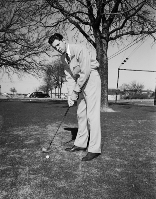 Image of Glenn Charles Amon, playing golf. Who had recovered from polio after being diagnosed when he was younger. Published in Fort Worth Star-Telegram morning edition January 4, 1951.