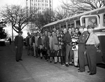 These 28 young Army and Air Force enlistees were happily "ready to go" when they began boarding and chartered bus in front of the United States Courthouse for the district recruiting headquarters in Dallas. At extreme left is the chief recruiter here, Master Sergeant Hubert O. Gardner Jr., and at the head of the double line is Sergeant First Class Chester L. Hammond with the bus driver, C. F. Skelton. Enlistments in the Army, Air Force and Navy continued above average after the post holiday rush, and Marine recruiters reported "still in business." Published in Fort Worth Star-Telegram evening edition January 3, 1951.