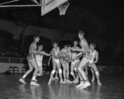 Image shows a basketball game between Poly and Tech. In the center shows a basketball injuring Dick O'Neal as Bob McQuitty, Raymond Martinez (3), J. B. Holland (4) and Thomas Curruthers (5) gather around. Poly won the game. Two unidentified players, left.