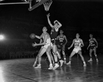 Image shows a basketball game between Arkansas University and Texas Christian University (TCU). Harvey Fromme is shown taking aim for goal. TCU defeats Arkansas, 42-31. From left to right, is Gene Lambert reaching in air and Toar Hester (55) and Richard Allen (29). One unidentified player on court, bottom right.