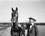 Image shows Song Reveler, Fort Worth entry in the gaited class junior stake in the 1951 Southwestern Exposition and Fat Stock Show. The horse, owned by Miss Mary Leonard of Fort Worth, is shown with trainer, A. J. B. "Doc" Beasley. Published in the morning edition, January 21, 1951.