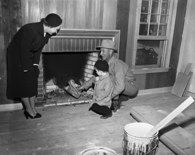 Image shows Mrs. Vane Gillmore and son, Allan, watch W. A. Hand, builder, as he demonstrated the "draw" in the fireplace at the Gillmore home, being built at 205 Crestwood Dr. Published in Fort Worth Star-Telegram morning edition January 14, 1951.