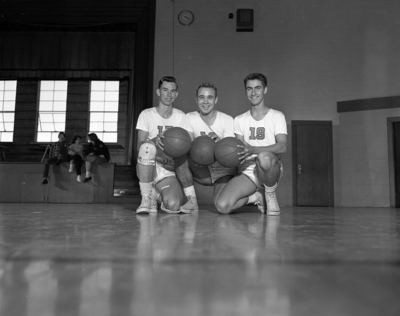 When starters tire, these three Birdville cagers get the call to relieve. Left to right, Fred Rogers, Joe Angell and Roy Kruge, lone freshman on team who's considered top prospect. Published in Fort Worth Star-Telegram evening edition January 12, 1951.