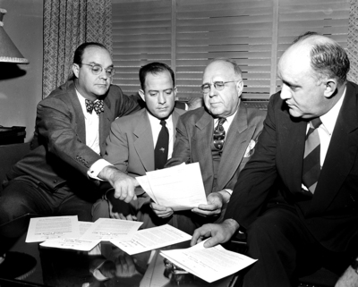 Judges and award chairman look over nominations for "Fort Worth's Outstanding Young Man of 1950", left to right, Berl Godfrey, Charles Ringler, committee chairman; are two other judges. Doctors M. E. Sadler and Law Stone who were out of town. Four men wearing suits looking at documents.