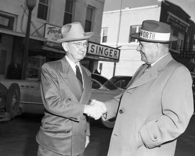 Chamber of Commerce Manager Frank Craddock of Hillsboro, left, welcomes Colonel C. S. Elliot. Published in Fort Worth Star-Telegram morning edition January 11, 1951.
