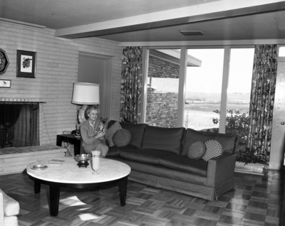 Fort Worth. City of. Residences. Shot of home of Mr. and Mrs. Chrles E. Armstrong at 4700 Winthrop. Mrs. Armstrong shown in living room.