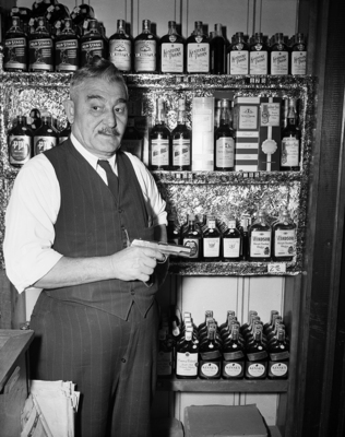 Theodore Harachs, shown with pistol he wrestled from the would-be robber. Harachs is standing next to shelves of liquor.