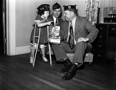 Cathy Adkins, Tarrant County's poster girl for the 1950 March of Dimes, gives a pep talk to Legionnaires Tommie Gay, center, and C. C. Downs, who will collect funds for the polio drive at Golden Gloves bouts. Cathy spent a year in treatment of polio. She wears crutches, corset and full-length leg braces to support her walking.