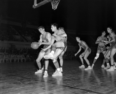 Texas Wesleyan College's (TWC) Lou Zastoupil, right, stymies Calvin Axtell of North Texas as latter tries to dribble past the cager at Will Rogers Memorial Coliseum. TWC won. Published in Fort Worth Star-Telegram evening edition January 13, 1951.