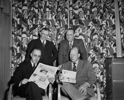 Jimmy Dolan and H. M. Belville Jr., left to right seated, look over schedules of WBAP during a visit there. Station Director Harold Hough, left, and manager George Cranston, right, (standing) look on. Dolan and Belville are NBC officials covering the NCAA convention in Dallas. Published in Fort Worth Star-Telegram morning edition January 13, 1951.