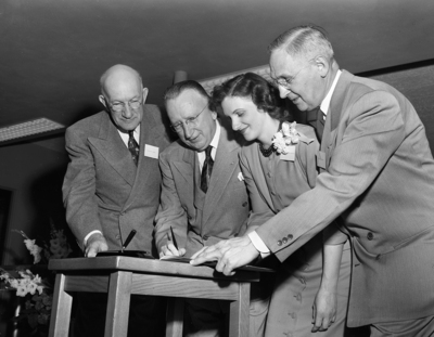 Claude P. Coates, second from left, signs the guestbook during an open house in the Rhea Building while his hosts watch. At left, is Cleaves Rhea, president of the National Service Automobile Insurance Company. At right is Frank Roberts, vice president of the same firm, which owns the building. Mrs. Dorothy Edmondson, secretary to Roberts, is holding the book. Published in Fort Worth Star-Telegram morning edition January 14, 1951.