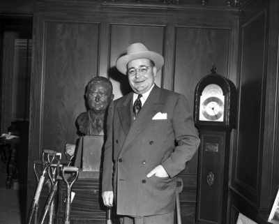 J. Kaye Ewart of Tacoma, Washington, spoke at a meeting of the Fort Worth Chapter of the American Institute of Banking. He is wearing a Shady Oak hat. Published in Fort Worth Star-Telegram morning edition January 16, 1951.