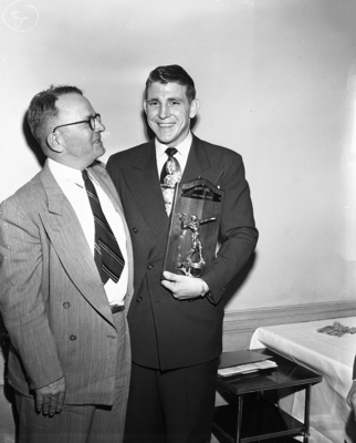 Coach L. R. (Dutch) Meyer, left, congratulates End Bill Moorman, presented Grassy Hinton Award as "most conscientious player" at Texas Christian University (TCU) football banquet at Fort Worth Club. Published in Fort Worth Star-Telegram morning edition January 17, 1951.