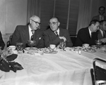 Dan D. Rogers, left, Texas Christian University (TCU) trustee, chats with Dr. M. E. Sadler, TCU president, during banquet honoring Frog grid men at Fort Worth Club. Published in Fort Worth Star-Telegram morning edition January 16, 1951.