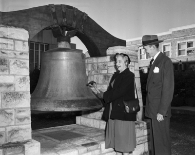 Ringing in new hope for those affected by polio, a peal of appeal for dimes was heard from the old fire bell at the City Hall at noon. Mrs. James Leonard, executive secretary of the Tarrant County Chapter of the National Foundation of Infantile Paralysis, and Rice Tilley, co-chairman of the March of Dimes campaign joined in opening he drive by sounding the bell. Published in Fort Worth Star-Telegram evening edition January 15, 1951.