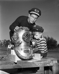 Captain Johnnie Burns of Eagle Mountain Lake, exhausted after his work in Lake Sweetwater, shows is diving outfit to son Mike, 5. Published in Fort Worth Star-Telegram morning edition January 16, 1951.
