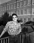 Image shows a bust shot of Nick Georges. He is shown outdoors leaning against railing in front of a unidentified building. There is two cars in the background parked. Published in the Fort Worth Star-Telegram evening edition, January 19, 1951.