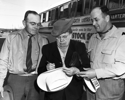Miss Ollie E. Clarke, center, manager of the Albany Chamber of Commerce autographs the hat of Dick Knight, right, a member of the East Fort Worth and South side Lions club group which told West Texans about the Southwestern Exposition and Fat Stock show. At left is R. C. Daniell, Albany Mayor. Published in Fort Worth Star-Telegram morning edition January 17, 1951.