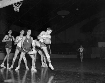 Little Meto Metiff, Paschal's 5-4 guard, grabs a rebound while Amon Carter Riverside's Phil Withers (11) and Metiff's teammate, Charles Steele watch. Paschal won to remain unbeaten, 55-32. Published in Fort Worth Star-Telegram morning edition January 17, 1951.