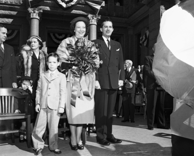 Governor and Mrs. Marialice Shivers and one of their children pause on the Capitol steps in Austin after his inauguration for his first full two-year term. The governor wears the same tie, emblazoned with the Lone Star flag, that he wore when first sworn in as governor after the death of Governor Jester. Published in Fort Worth Star-Telegram evening edition January 17, 1951.