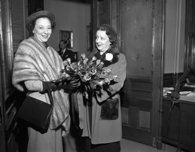 Texas' first lady, Mrs. Marialice Shivers, left, gets a last minute "once-over" from her secretary, Miss Hazel Avery, before the inauguration of her husband in Austin, Texas. Published in Fort Worth Star-Telegram morning edition January 17, 1951.