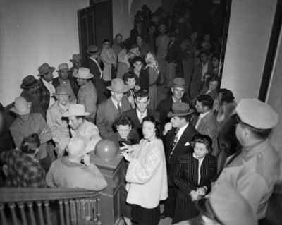 The several hundred persons shown outside the courtroom at Brady were unable to get inside to hear the trial of Ms. Sandra Peterson, who was charged with the murder of Mr. Lewis Patterson.