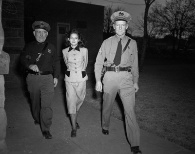 Pictured here is Loretta Fae being escorted by two unidentified officers.