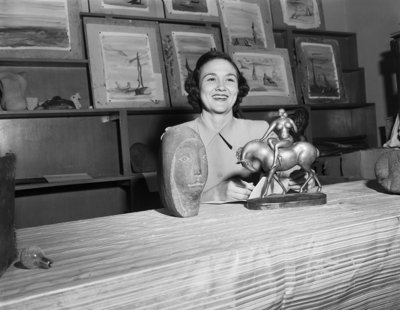 Mrs. Alice Mummert Payne, will assume full-time duties as Fort Worth Art Association secretary, is shown getting a preview of her duties. She is checking sculpture by Flannagan and LaChaise preparatory to "The Recent Past" exhibition. Published in Fort Worth Star-Telegram morning edition January 18, 1951.