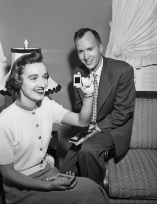 Mrs. Jack C. Nelson scans a picture made by her husband, during their trip from the Middle East. The couple have been stationed there for two and one-half years and are on their way around the world by plane. Published in Fort Worth Star-Telegram morning edition January 18, 1951.