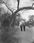 A recheck of the proposed route of the University Dr. widening program by Park Director Adams and city engineers has saved several large Trinity Park trees. City Radio Patrolmen W. E. Whitehurst, left, and W. J. Ewing, right, doff their hats to a sprawling pecan which extends over the park drive. Published in Fort Worth Star-Telegram evening edition January 17, 1951.